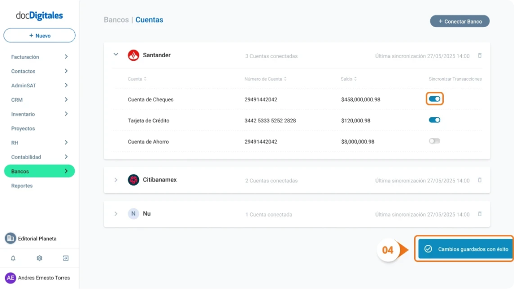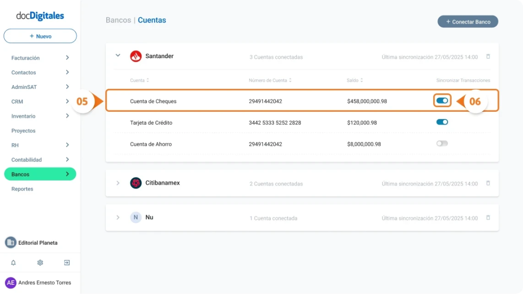 - Al final de la fila, da clic en la opción Sincronizar transacciones para activarla nuevamente.