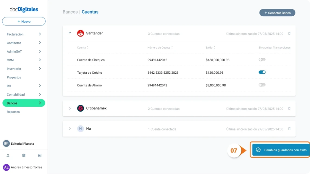 - La sincronización quedará activa y el sistema mostrará la notificación “Cambios guardados con éxito” para confirmar la acción.