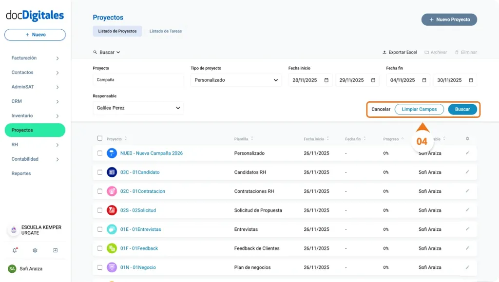 Si administras varios proyectos a la vez, puedes utilizar la función de Buscar para filtrar y localizar rápidamente el proyecto que necesitas consultar. Esta herramienta te permite combinar diferentes criterios de búsqueda y localizar el proyecto buscado.