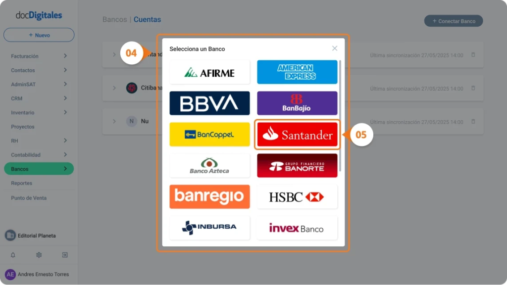 - Se abrirá una ventana emergente donde encontrarás el listado de bancos disponibles para su conexión.