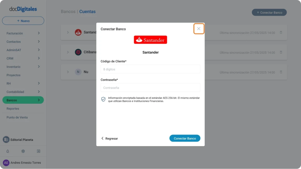 - Una vez ingresada la información da clic en el botón Conectar Banco dentro de la ventana emergente.