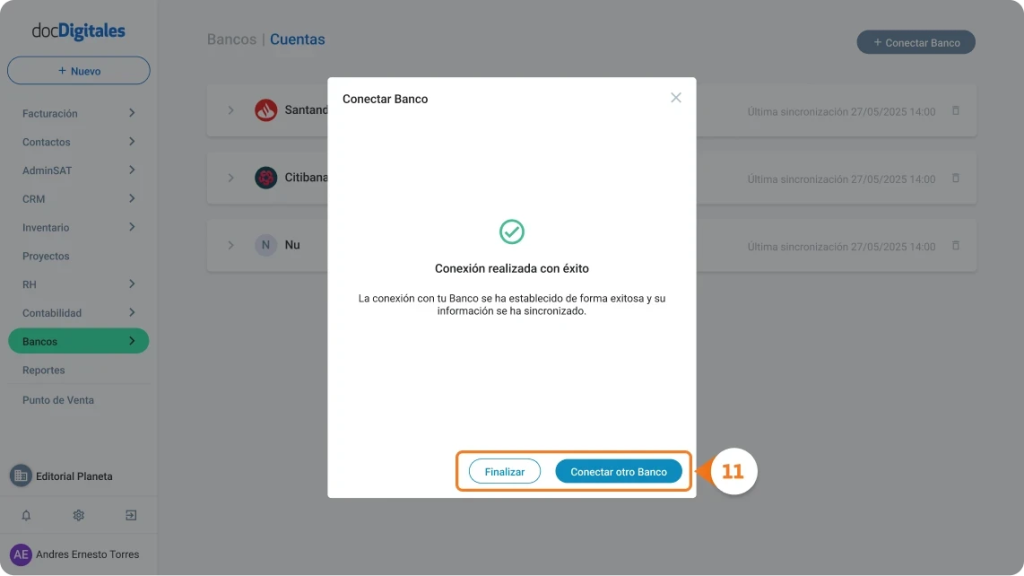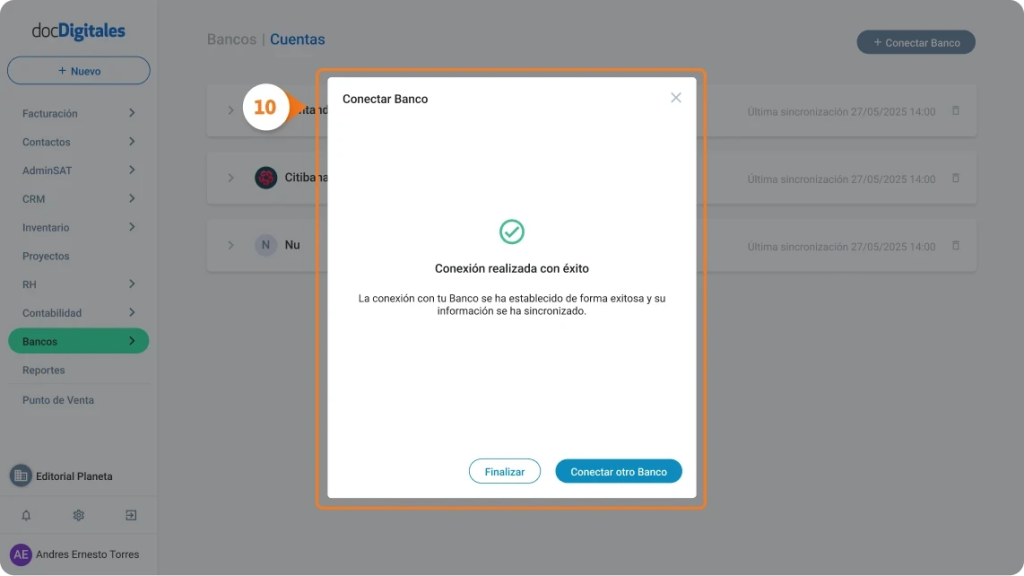 - Si la conexión se realiza exitosamente, verás el siguiente mensaje en la ventana emergente “Conexión realizada con éxito. La conexión con tu Banco se ha establecido de forma exitosa y su información se ha sincronizado”.
