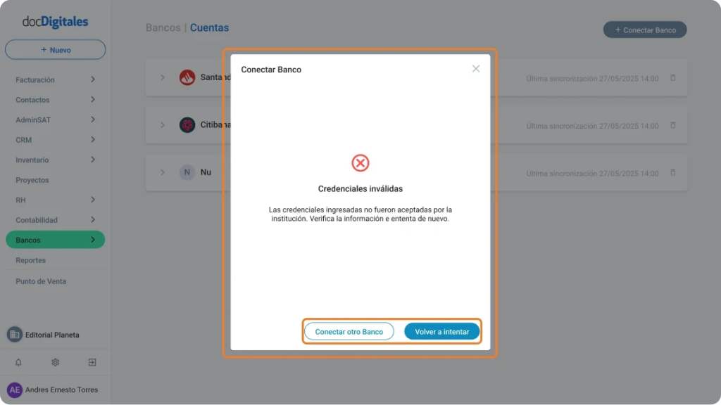 Nota: En caso de que la conexión sea fallida, se mostrará el siguiente error: “Credenciales inválidas. Las credenciales ingresadas no fueron aceptadas por la institución. Verifica la información o intenta de nuevo” . Para intentarlo nuevamente da clic en el botón Volver a intentar e ingresa tus datos de manera correcta.