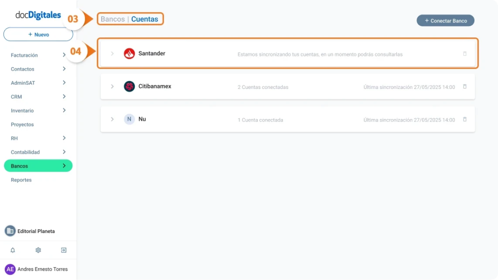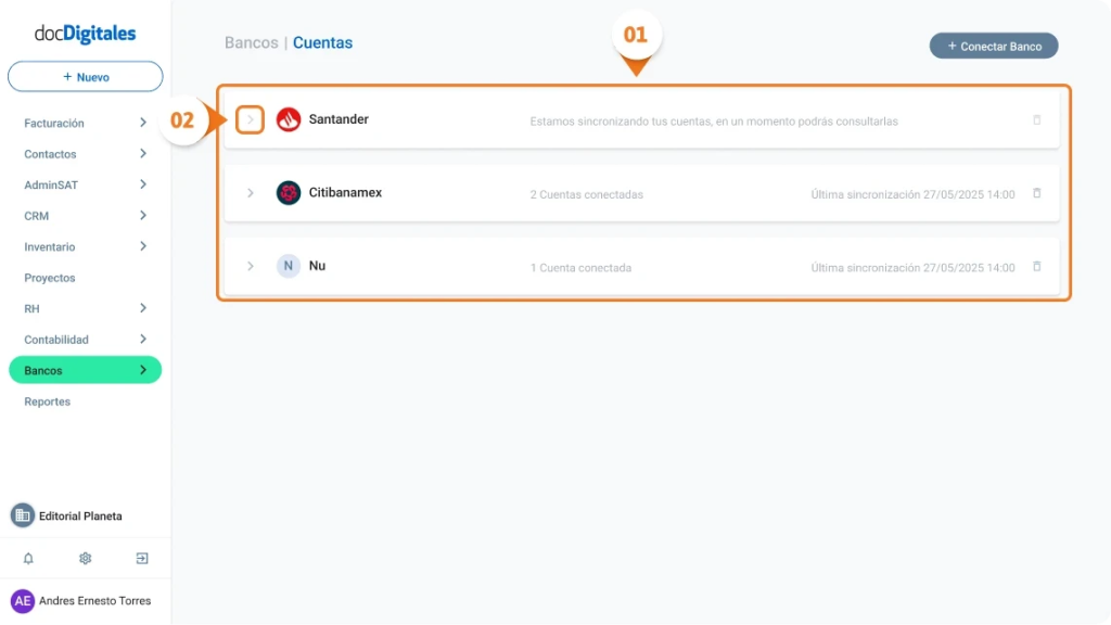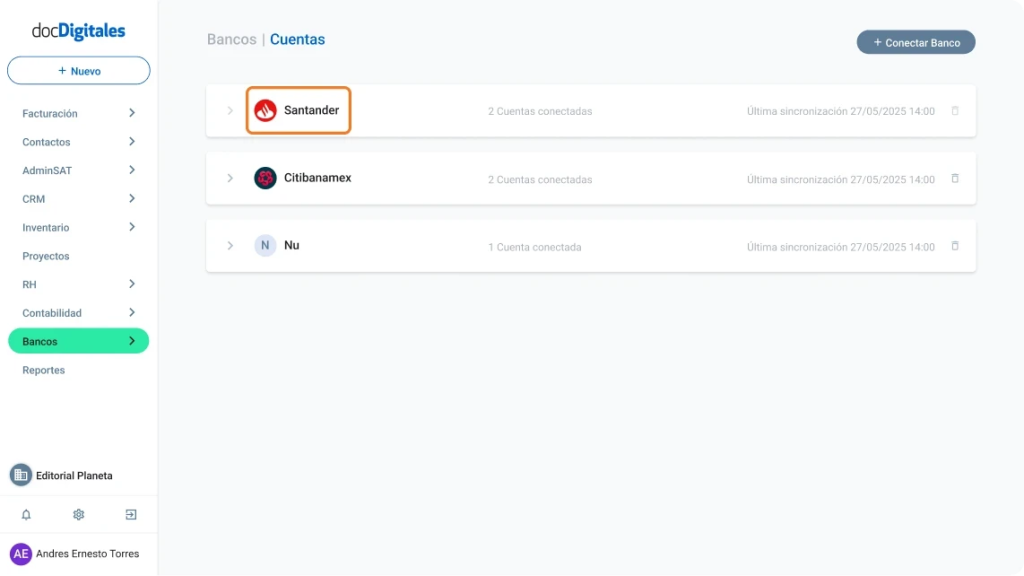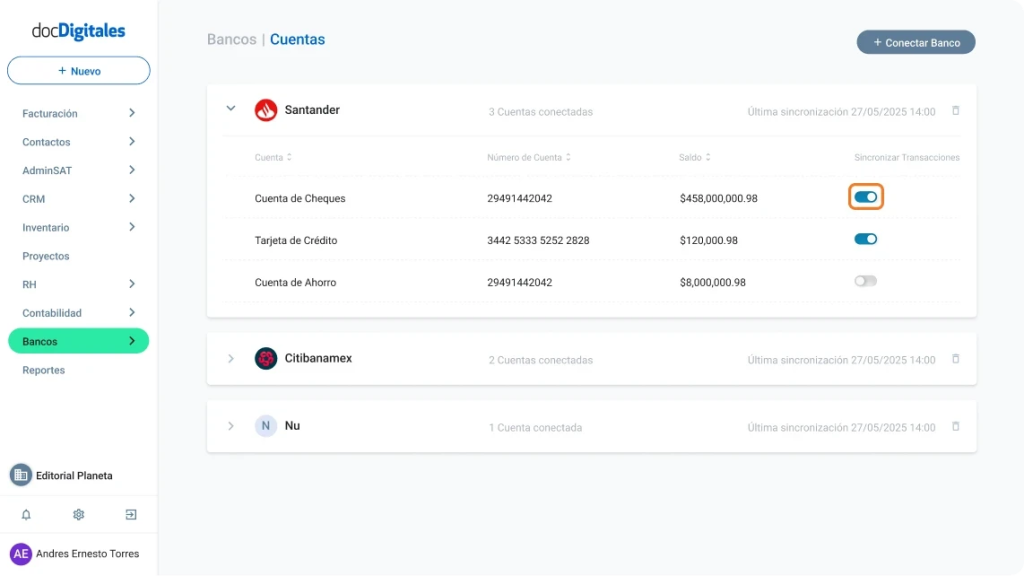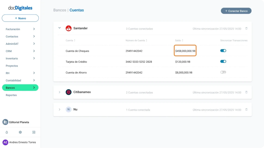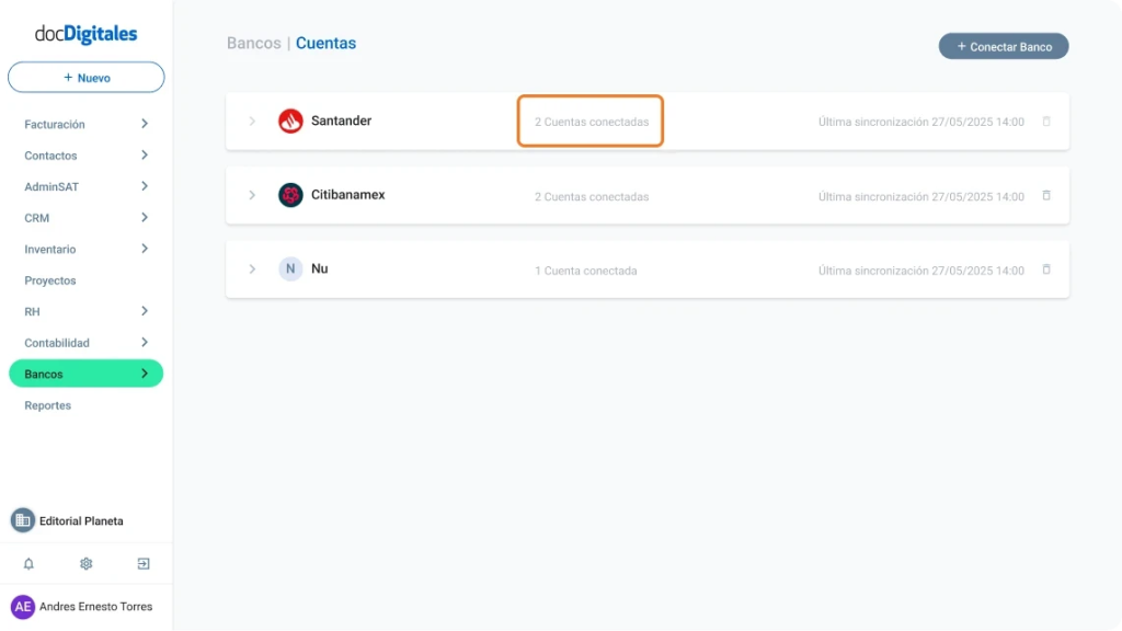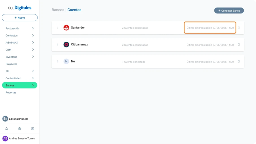 - Última sincronización: Muestra la fecha y hora de la última actualización de movimientos bancarios.