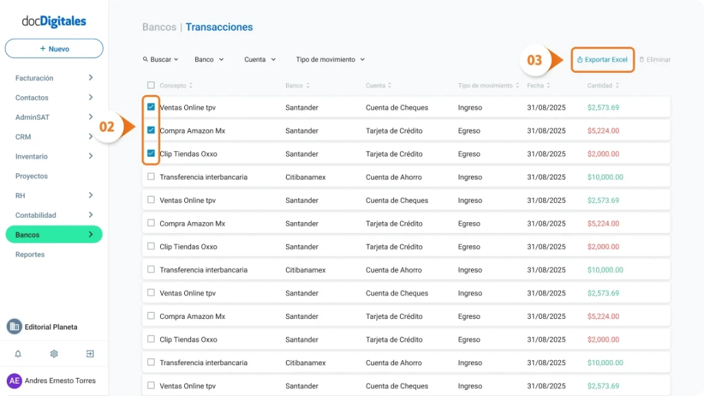 - Después de seleccionar los movimientos deseados, haz clic en Exportar Excel en el panel superior.