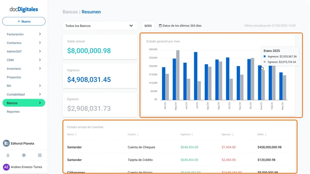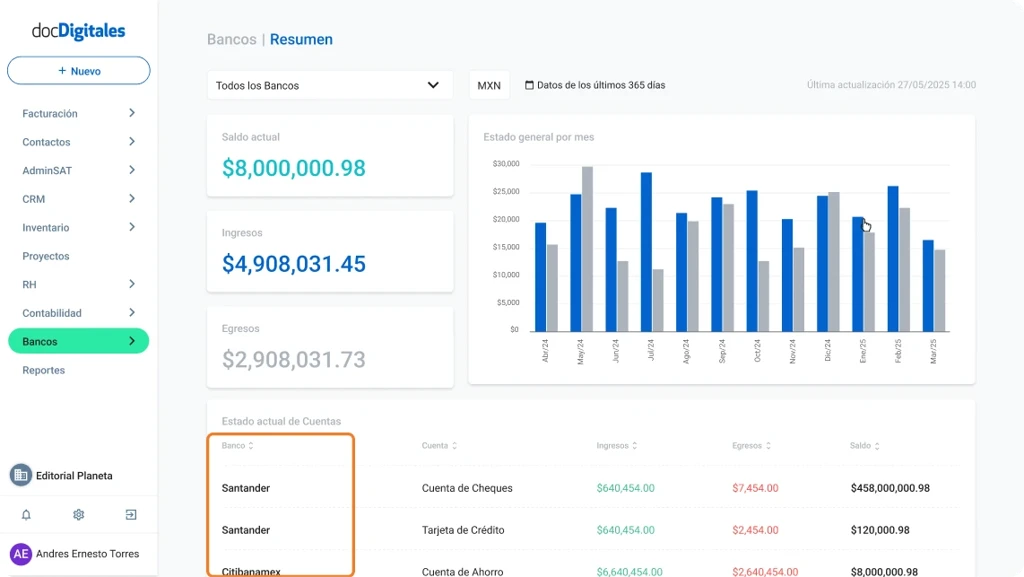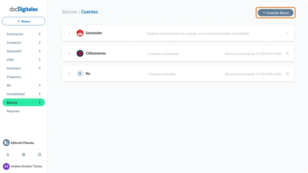 El módulo de Bancos te permite centralizar y consultar la información bancaria de tu empresa desde un solo espacio. Desde este módulo puedes conectar tus cuentas, revisar movimientos y saldos, hasta analizar ingresos y egresos sin necesidad de ingresar a cada banca por separado.