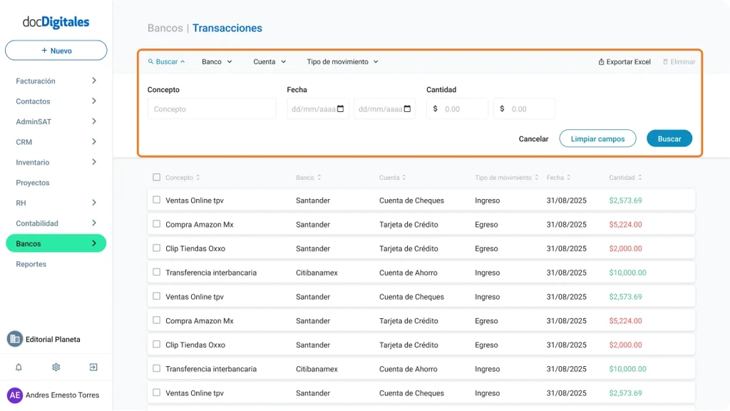 - Filtra transacciones por banco o cuenta.