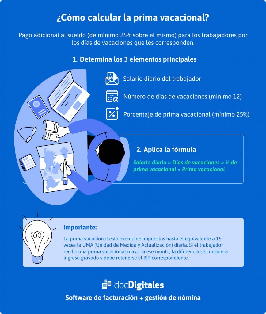 | 3. Cálculo prima vacacional | Salario diario × días de vacaciones × % de prima vacacional | 500 × 16 × 25% = $2,000 |